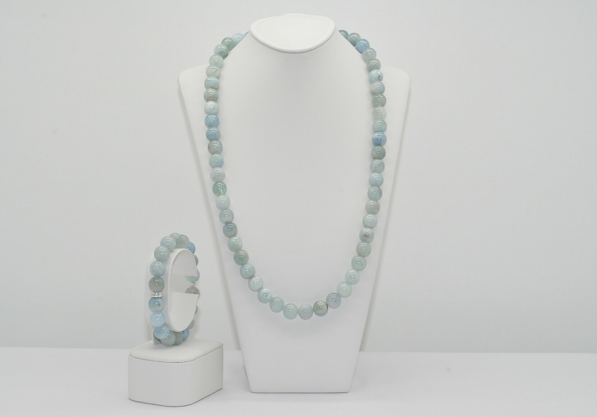 Drahokam akvamarín je pomenovaný podľa farby morskej vody - aqua marina. Tento set náramku a náhrdeľníku pochádza z Brazílie. Akvamarín, jeden z najobľúbenejších drahokamov na svete, ktorý je podľa grétskej mytológie posvätným kameňom boha morí, Poseidona je aj skvelý na posiľnenie srdca a pomáha pri kožných alergiách a bolestiach hlavy.